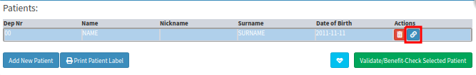 - Under Patients, in the top right corner >> Select the Patient you want to link clinical data to on this debtor file (see the top right corner of the screen) >> Under the Actions column for this patient >> Click on the BLUE (See patient linked to this patient, link this patient to another patient) button.