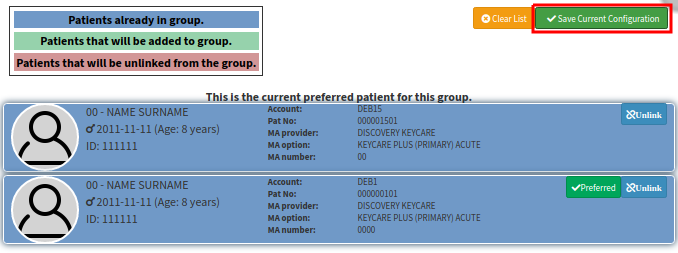 - Click on the GREEN 'Save Current Configuration' button to save the linking of the clinical data to the preferred patient.