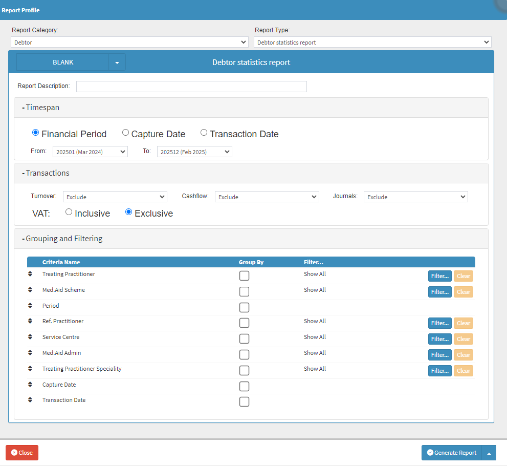 Debtor Statistics Report: A Debtor Statistics Report allows a User to set up and print a Report with certain information regarding specific statistics of the Debtor, such as summarised Transactions Per Turnover, Cash Flow and Journals. This Report can be customised to suit the needs of the Practice. For more information regarding the Debtor Statistics Report, please refer to the user manual: Debtor Statistics Report.