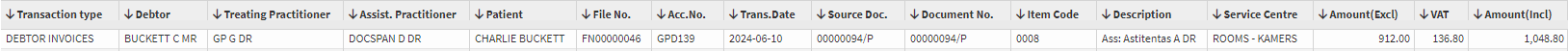 - Debtor: The Surname, Initial and Title of the account holder where the Assistant was billed.