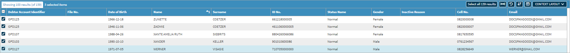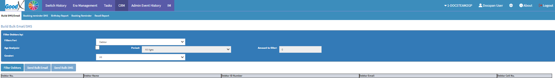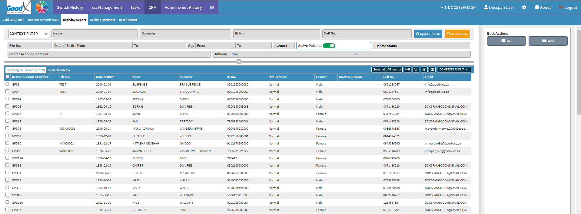 Please Note: From the Birthday Report screen, the user is able to send Bulk SMS Messages or Emails by selecting more than one Patient/Debtor.