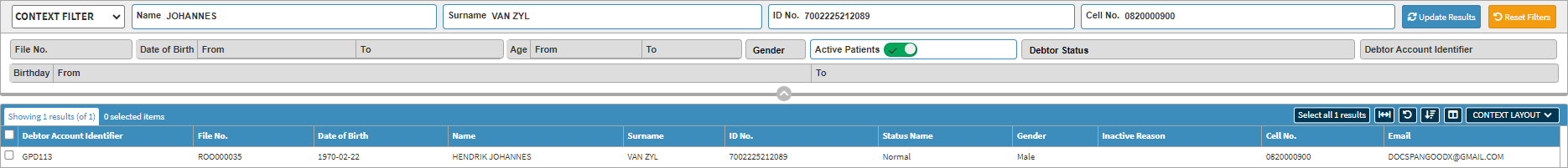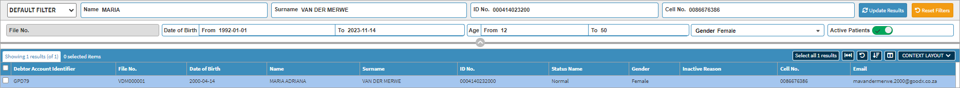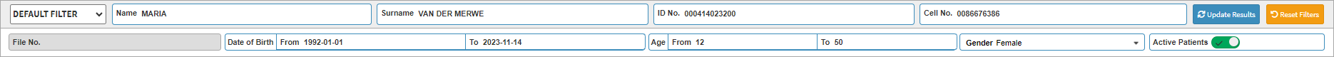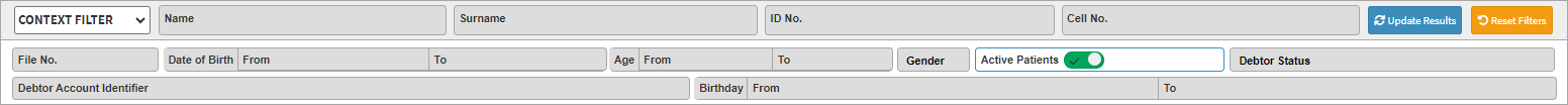 - To use the Birthday Report filter set on Default Filter you need to type the Debtor/Patient's information into the relevant text fields/search boxes.
