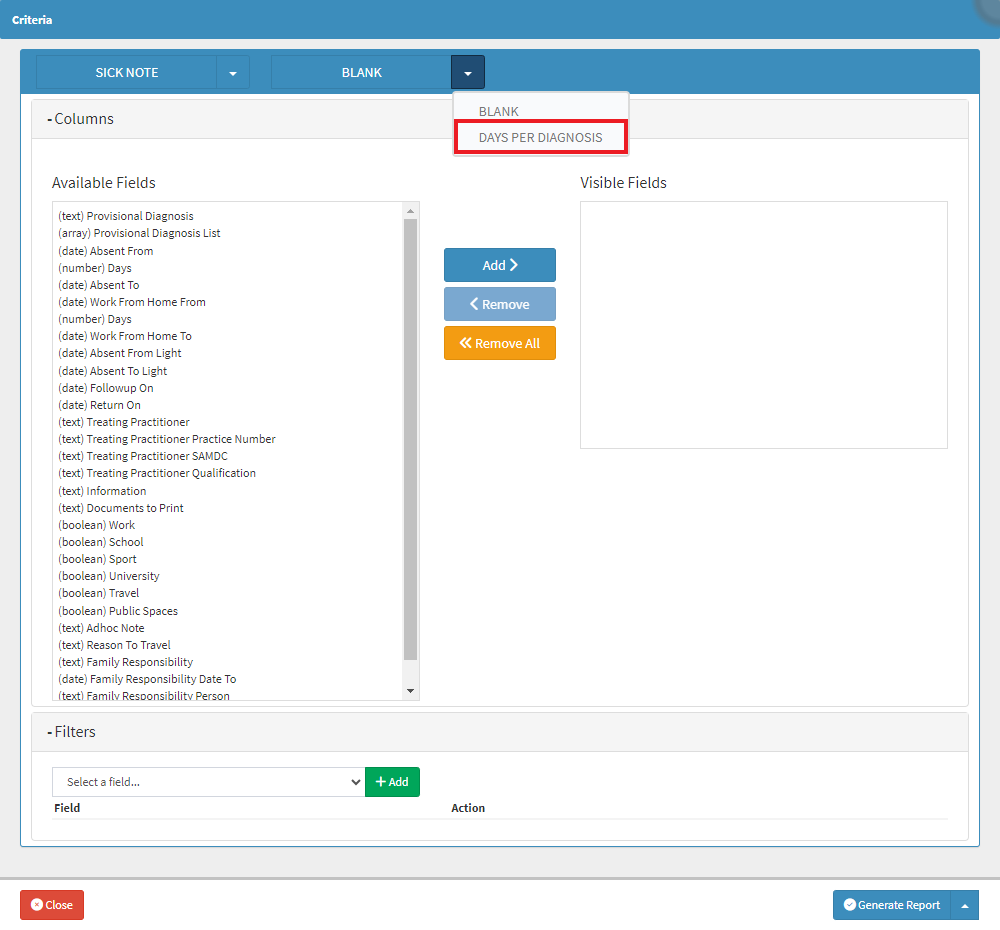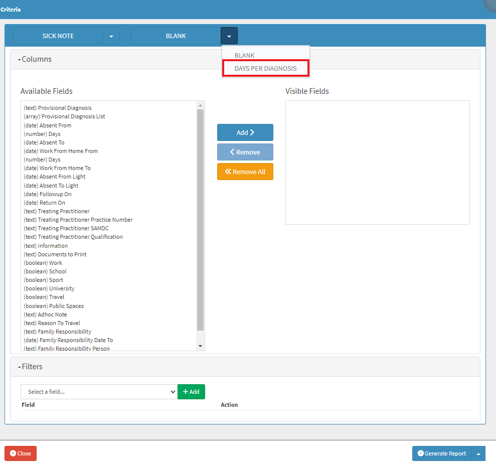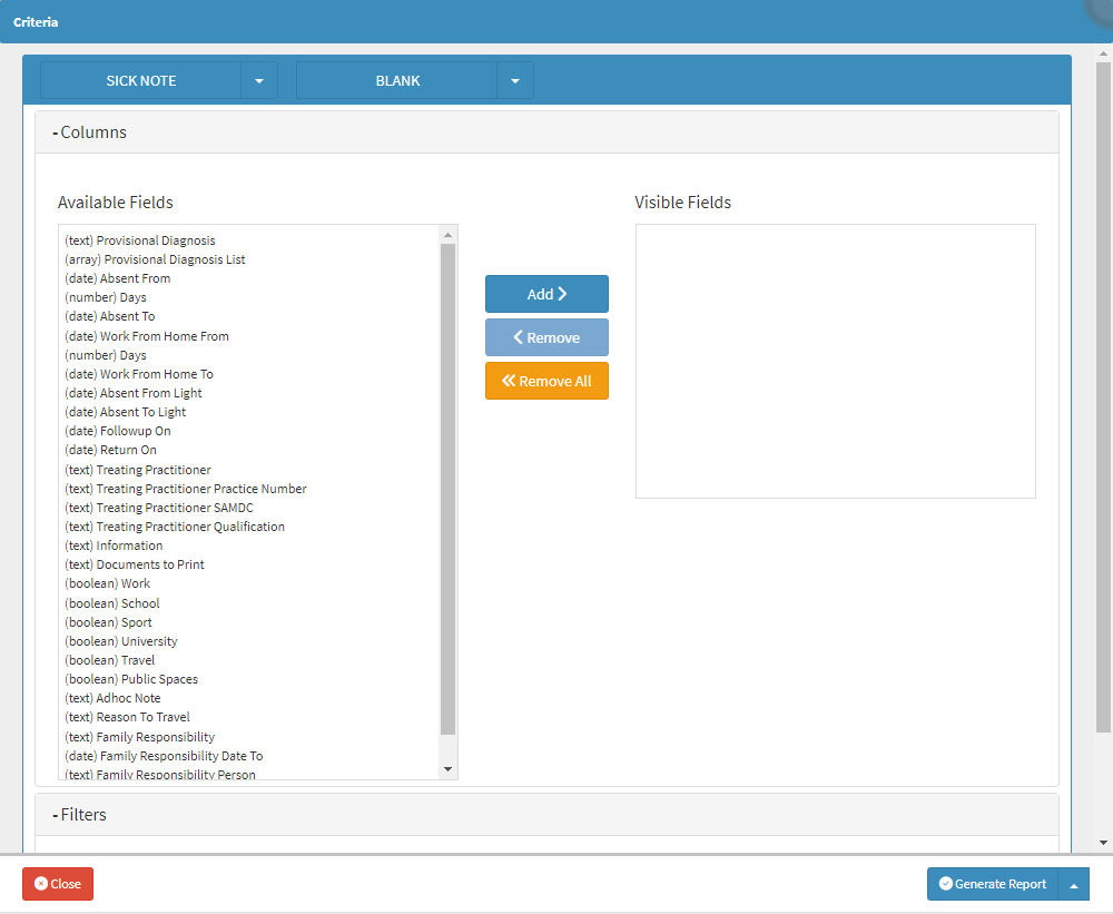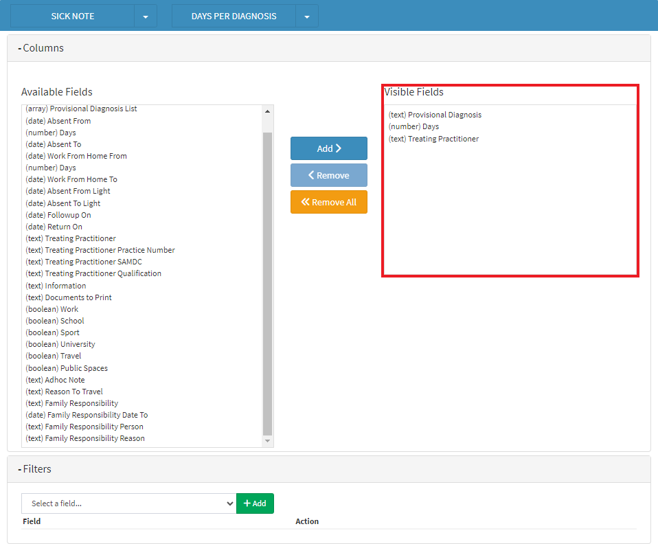 - Click on the Add button to move the selected option to the Visible Fields section.