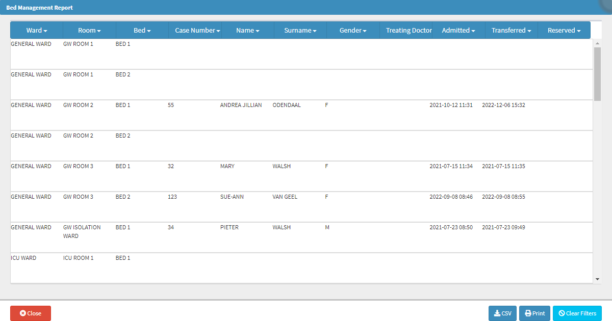 Please Note: The columns under Case Number, Name and Surname which are empty indicate that there are currently no Patients occupying the corresponding beds.