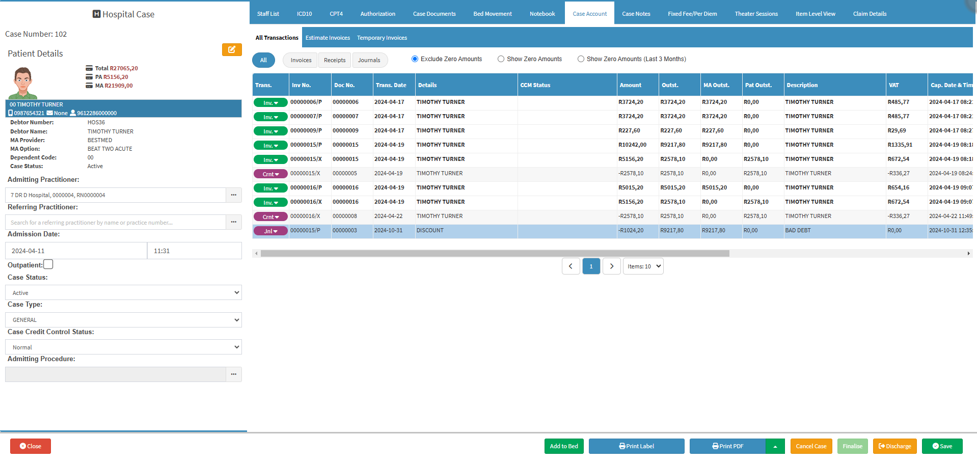 The Case Account Tab provides a comprehensive view of all transactions related to a Patient’s Case. It also enables you to perform various actions on the Case Account, such as creating Receipts, Credit Notes, Journals, and promise-to-pay agreements. Additionally, you can download Invoices, view and action Estimates, and manage Temporary Invoices directly from this tab.