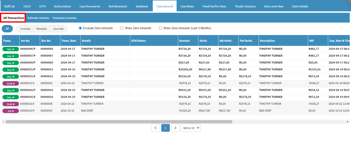 - For more information regarding the All Transactions tab, please refer to the user manual: Case Account - All Transactions.