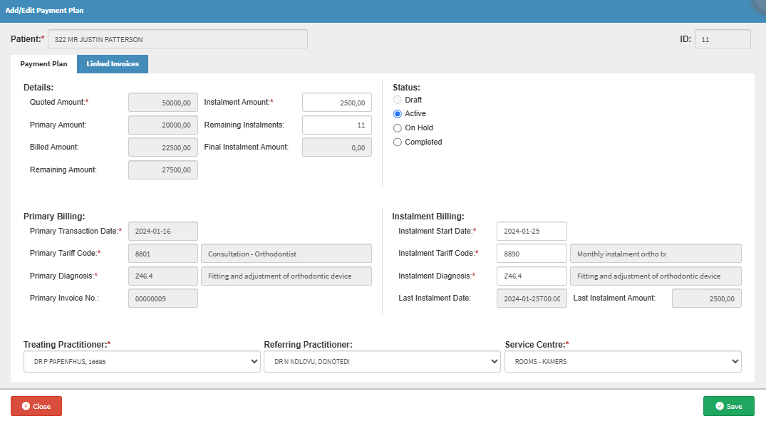 The purpose of the Linked Invoices sidebar is to ensure that all follow-up actions relating to an outstanding or linked account item can be completed without navigating away from the Add/Edit Payment Plan Screen. Staff can immediately review Patient demographics, contact details, Medical Aid information, and outstanding balances, and then act using the most suitable method.