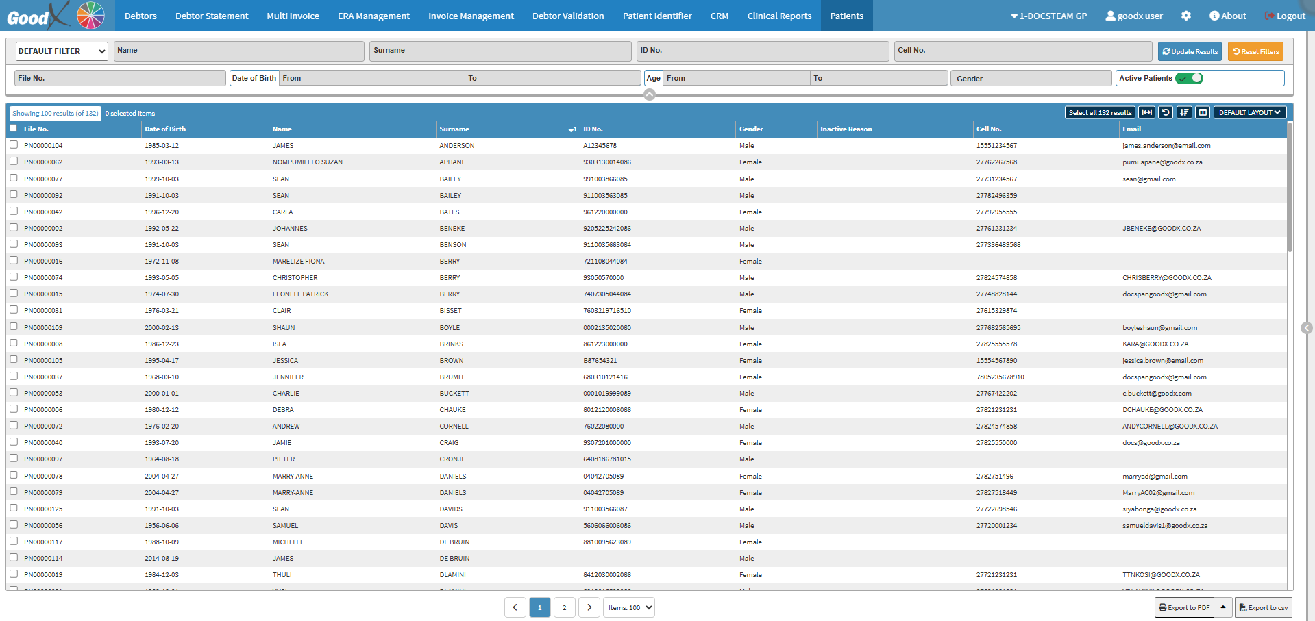 The Patients screen serves as a central tool for searching and filtering Patients that have been captured on the system, enabling you to locate a Patient's information using specific criteria fields quickly. By applying filters such as demographic details and account information, you are able to narrow down searches to find exactly the Patient record you need. This not only saves time but also ensures accuracy when accessing or updating Patient information. The Patient screen supports efficient workflow management, reduces administrative errors, and helps your Practices maintain well-organised Patient records for both clinical and financial purposes.