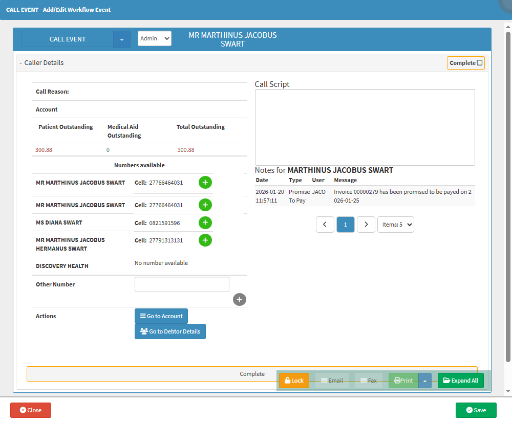 The Dial button opens the Call Event screen, where you can log, prepare for, or follow up on a phone call with a Patient or relevant contact. This screen displays available contact numbers, account information, outstanding balances, and provides space for call notes and feedback. While it does not initiate the actual phone call, it acts as a structured workflow for managing telephonic contact.