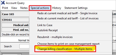 Click on the Special Actions tab and select the 'Change billing classification - Multiple items' options