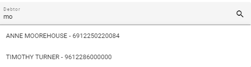 - A list of Debtors will appear as you type, from which you can make a selection. Only 1 character is needed for the list to appear.