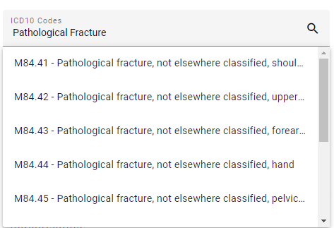 - A list of ICD10 Codes will appear as you type, from which you can make a selection. Only 1 character is needed for the list to appear.)