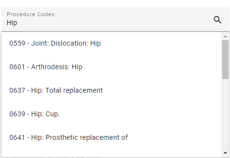 - A list of Procedure Codes will appear as you type, from which you can make a selection. Only 1 character is needed for the list to appear.)