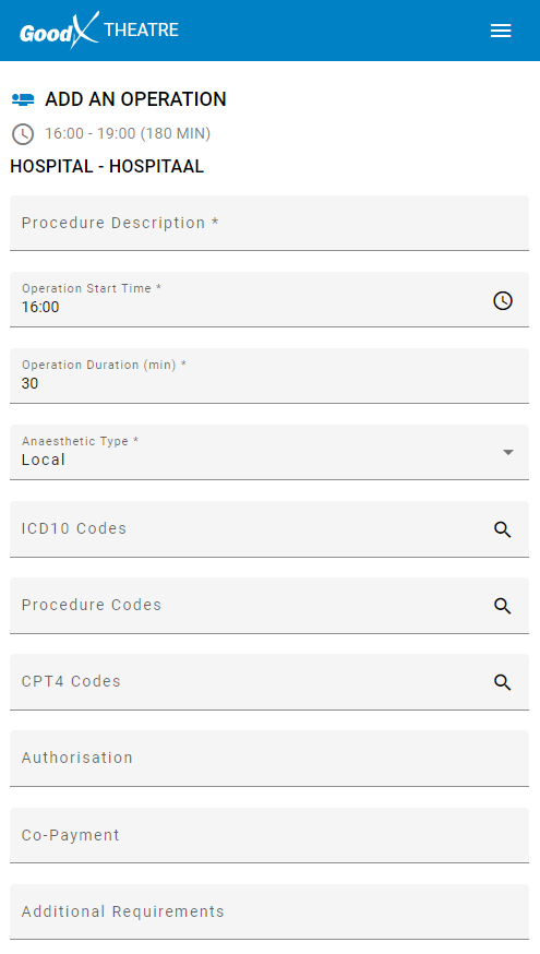 Please Note: The Duration of the Operation will be updated on the Operation Duration (minutes) field, Theatre List, and the Operation Booking on the GoodX Web App.