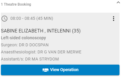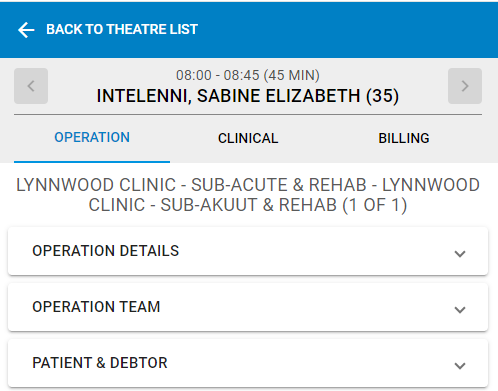 The Operation tab on a Theatre Booking gives an overview of all the details regarding the operation, such as when and where the operation will take place, the procedure details and the details regarding the team that will be performing the operation.