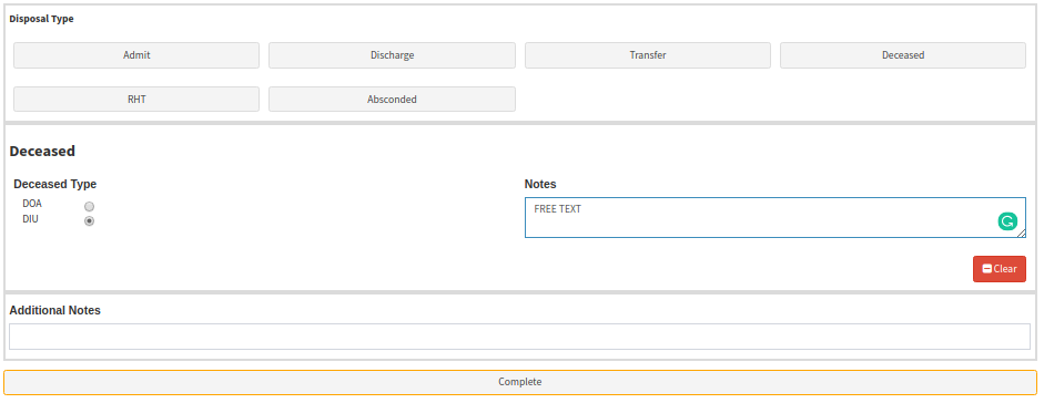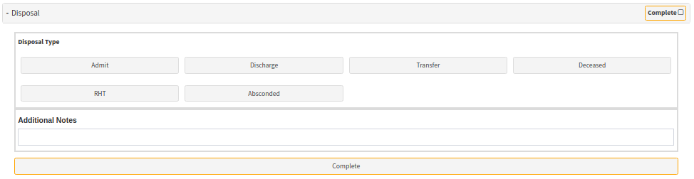 - Disposal: In this section, you will complete what happened to the Patient while they were in the ER. Were they admitted to the Hospital, Discharged, Transferred to another facility, Died, etc. Under every option is section that needs to be completed.