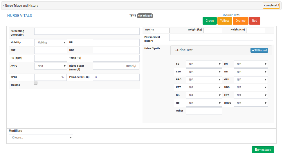 - Nurse Triage and History: refers to the formal process of early assessment of the patients attending an accident and emergency department by a trained and qualified nurse, to ensure that they receive appropriate attention, in a suitable location, with the requisite degree of urgency. The patient's Vitals will be completed in this section.