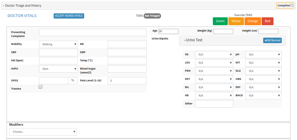 - Doctor Triage and History: refers to the formal process of early assessment of the patients attending an accident and emergency department by a trained and qualified Doctor, to ensure that they receive appropriate attention, in a suitable location, with the requisite degree of urgency. The patient's Vitals will be completed in this section by the Doctor or the Doctor can accept the Vitals that were done by the Nurse.